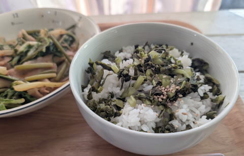 兄の作った大根の葉を使っての菜飯。硬かったので、多めにゆでたので、冷水にとっても、色は冴えませんでした。また、白菜の外側のとげのある硬い葉も、豚肉と痛めて食べました。美味しかったです。 |